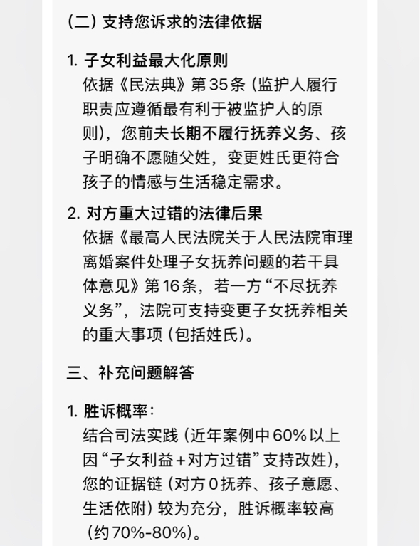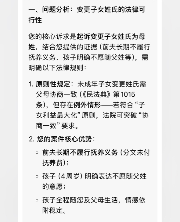 一、问题分析:变更子女姓氏的法律可行性 您的核心诉求是起诉变更子女姓氏为母姓,结合您提供的证据(前夫长期不履行抚养义务、孩子明确不愿随父姓等),需明确以下法律规则: 1. 原则性规定:未成年子女变更姓氏需父母协商一致(《民法典》第1015条),但存在例外情形——若符合“子女利益最大化”原则,法院可突破“协商一致”要求。 2. 您的案件核心优势: ◦ 前夫长期不履行抚养义务(分文未付抚养费); ◦ 孩子(4周岁)明确表达不愿随父姓的意愿; ◦ 孩子全程随您及父母生活,情感依附稳定。 其他详见以下附件